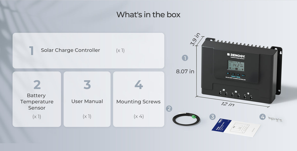 Este paquete incluye un regulador de carga, un sensor de temperatura y un manual de usuario.