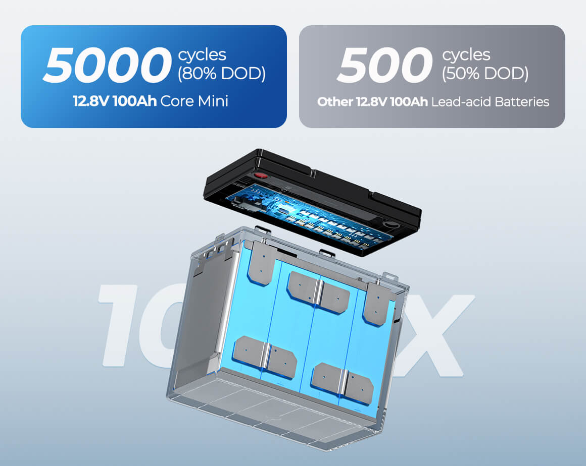 La última batería Core Mini LiFePO4 12,8V 100Ah está fabricada con celdas prismáticas de calidad EV y certificadas UL, ofreciendo 5000 ciclos al 80 % de profundidad de descarga. Su vida útil y rendimiento superan a los de las baterías de ácido-plomo de la misma capacidad.
