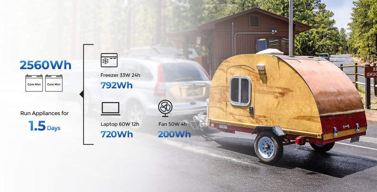 Maximiza tu espacio y reduce el peso con la batería Core Mini LiFePO4 de Renogy. Es la solución de energía perfecta para remolques tipo teardrop y otras autocaravanas pequeñas.
