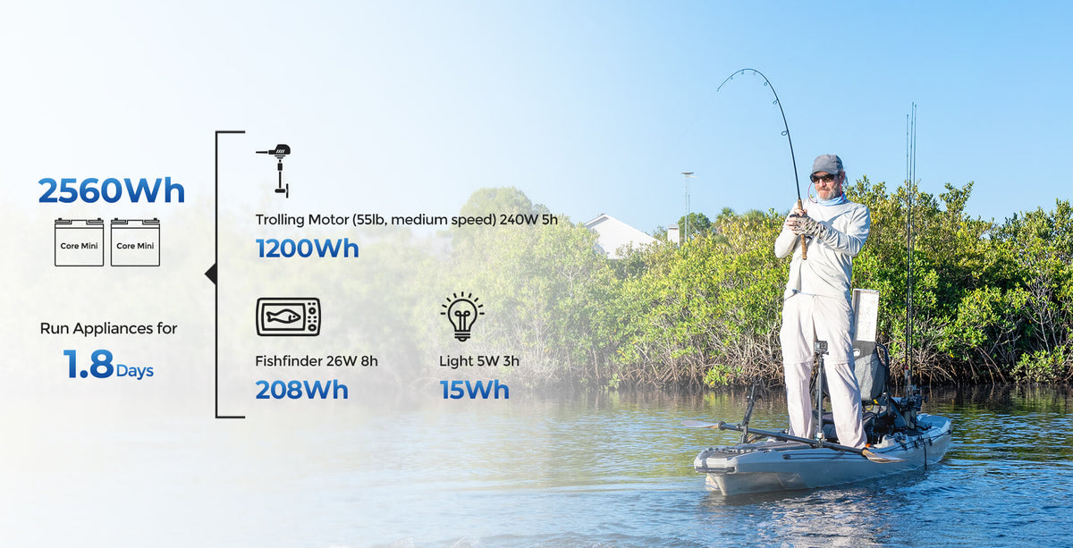 La batería Core Mini LiFePO4 12,8V 100Ah de Renogy proporciona energía fiable para tus motores eléctricos, sondas de pesca y otros equipos esenciales de pesca en kayak, manteniéndolos funcionando sin problemas para tu próxima gran captura.