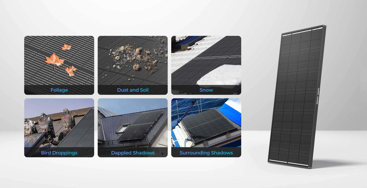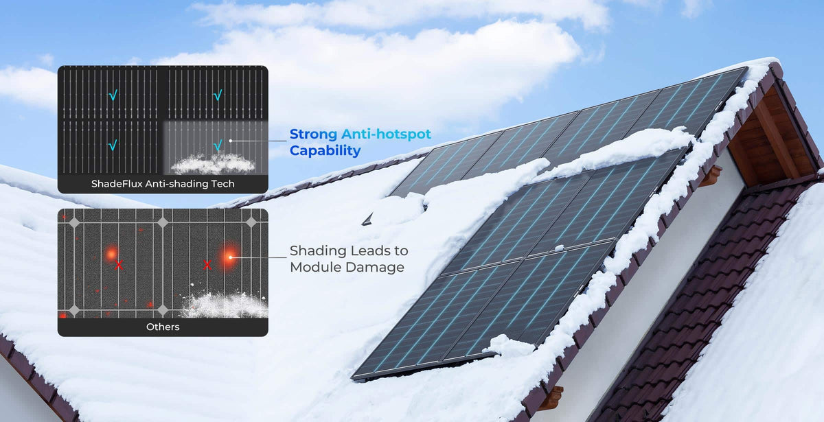 Desde sombras parciales hasta días con nieve, la tecnología ShadowFlux garantiza la máxima potencia de salida, eliminando cualquier preocupación por sombreado o acumulación de residuos.
