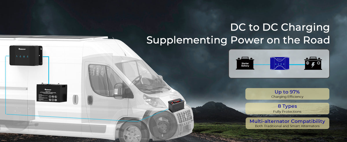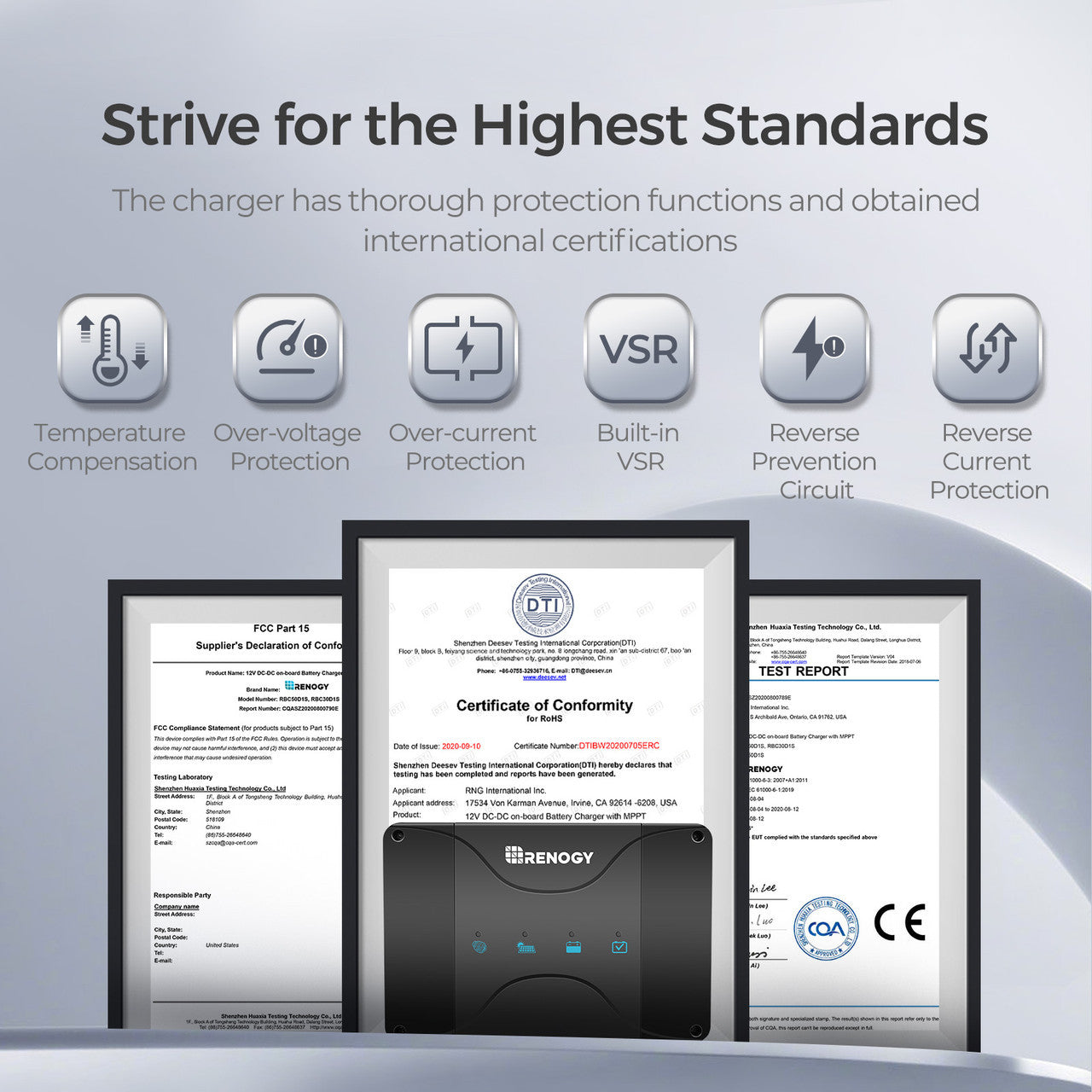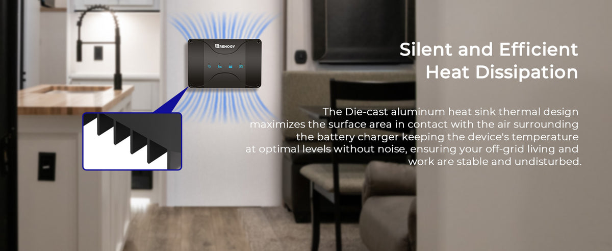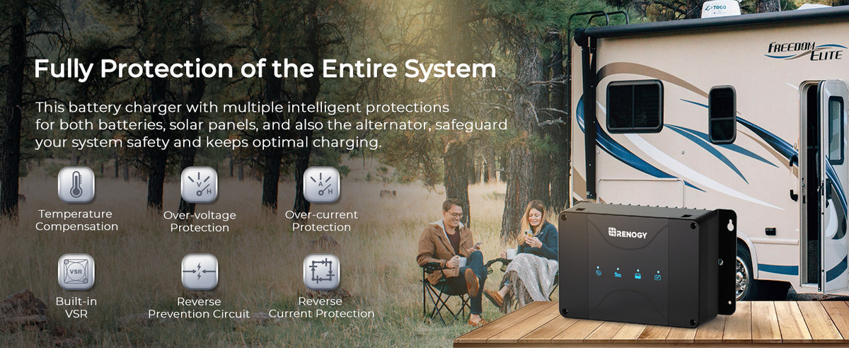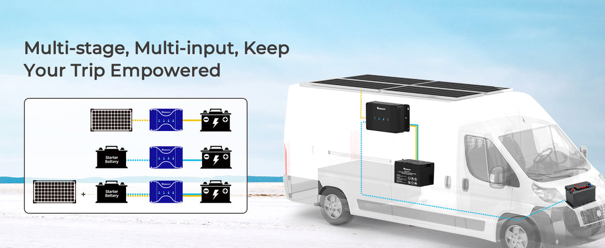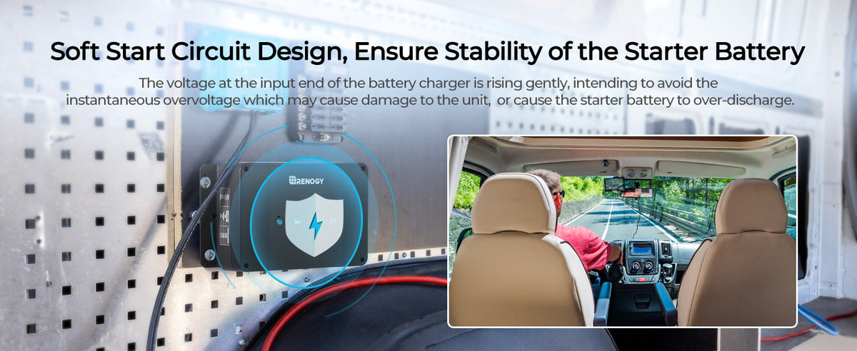 - 【Carga Eficiente con Entradas Múltiples】 El cargador DC-DC de Renogy incorpora un exclusivo sistema de carga dual. Gracias a su diseño de carga multietapa, puede recargar la batería auxiliar tanto desde la batería de arranque (a través del alternador) como directamente desde paneles solares conectados al equipo. Mantén tu batería doméstica siempre lista para tus aventuras fuera de la red.