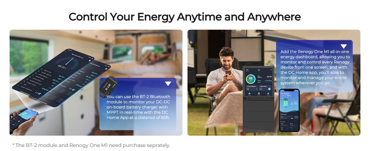 - 【Monitorización y Control Remoto】 A través del puerto de comunicación RJ45 y el Módulo Bluetooth BT-2, puedes conectar la app Renogy DC Home para supervisar y controlar el cargador en tiempo real desde tu smartphone. Una gestión más cómoda y moderna para tu sistema de energía.