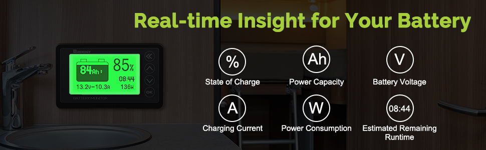 La retroiluminación se apagará automáticamente cuando la corriente de carga sea <100 mA y el consumo en espera es de solo 1 mA. Este monitor de batería cuenta con capacidad de almacenamiento de datos, guardando automáticamente los últimos datos de medición cuando se apaga.