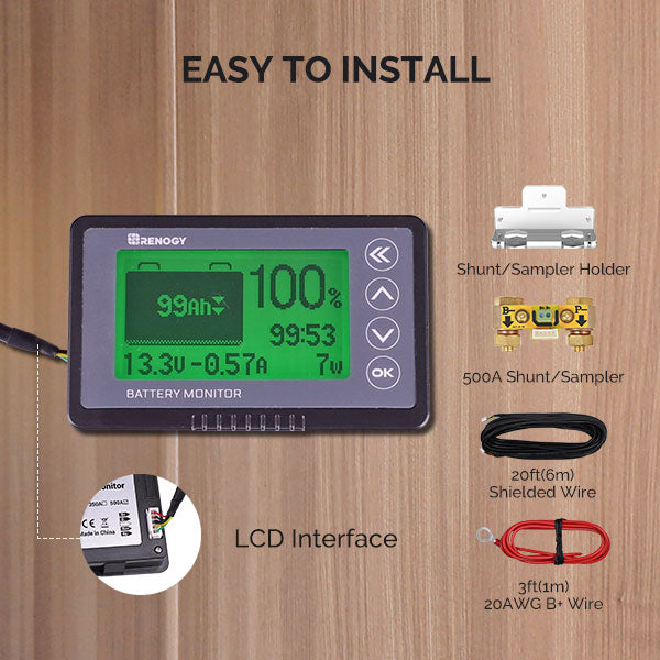 El paquete incluye la pantalla LCD, shunt de 500A, soporte transparente para el shunt, cable blindado de 20 pies y cable B+. El soporte transparente facilita enormemente el montaje del shunt, mientras que el cable largo blindado te permite monitorizar el estado de tu batería a distancia.