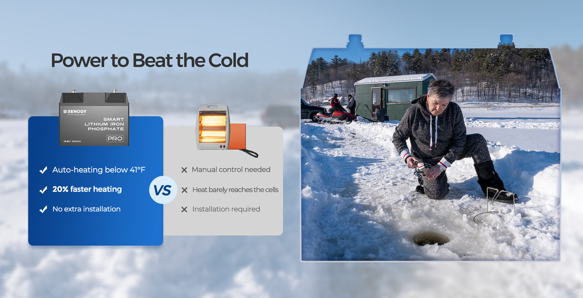 Para los entusiastas de actividades al aire libre en invierno, como la pesca en hielo, una batería LiFePO4 auto-calefactable es imprescindible. Esta batería Pro LiFePO4 12V 100Ah puede calentarse automáticamente con una corriente de carga superior a 4 A para garantizar una carga segura a temperaturas bajo cero, proporcionando energía constante para prolongar la vida útil de sondas de pesca y otros equipos esenciales.